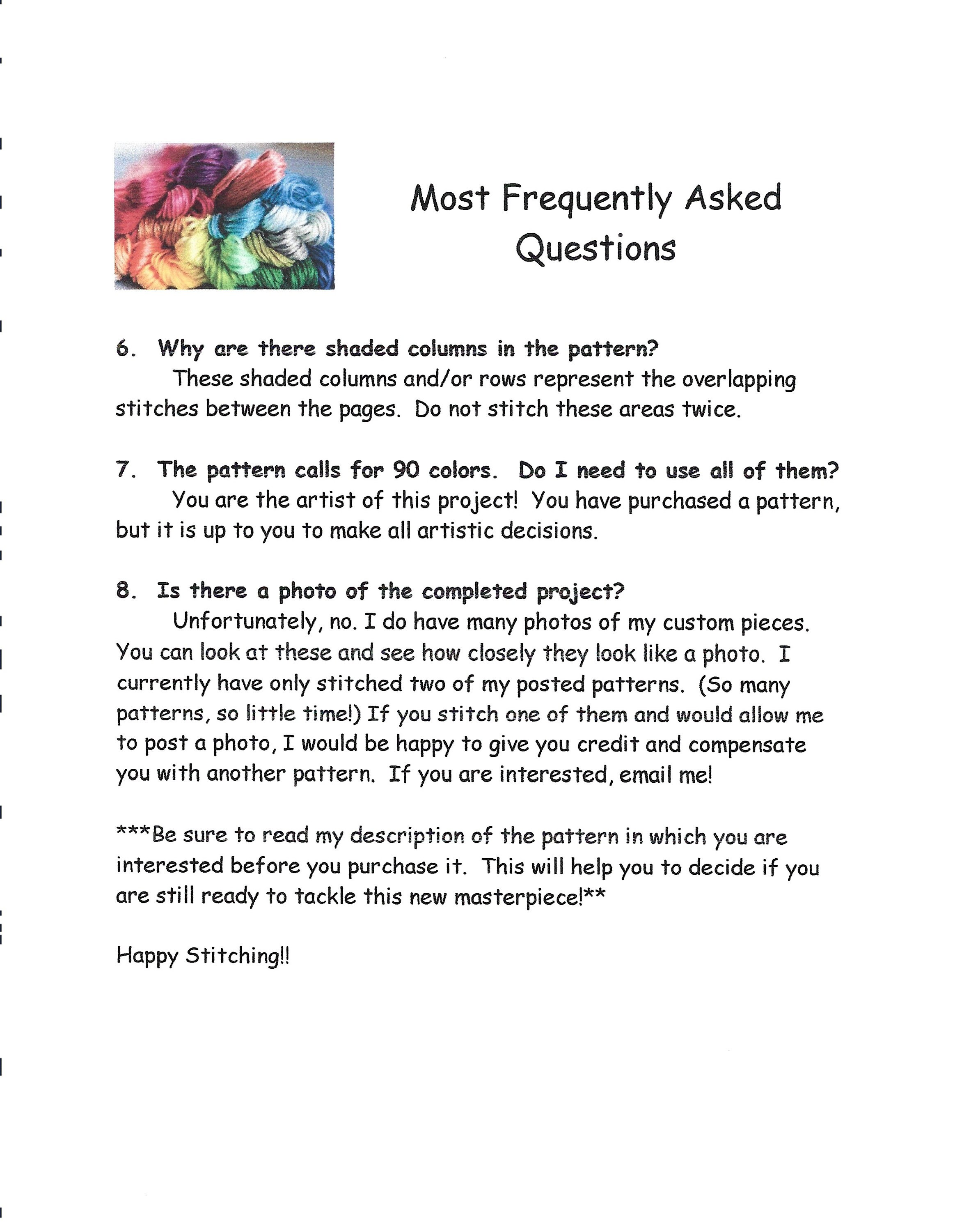 This PDF includes a 8 page black and white pattern and a 1 page list of required DMC floss. This project uses 80 DMC colors for vivid detail.